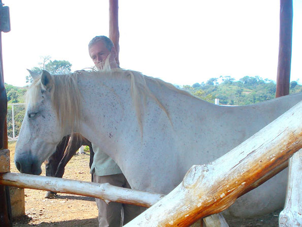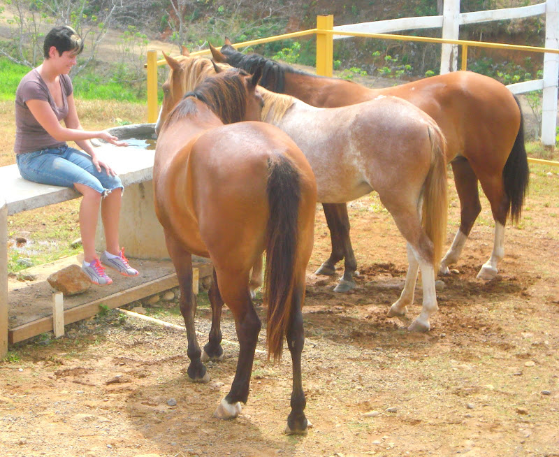 With Marsha's guidance, I approached these sweet creatures cautiously, knowing that trust would need to be built on both sides. As I relaxed, the horses worked their magic, and each one found a place in my heart. I'm told I was accepted as a part of all three herds! It's hard to describe the feeling of joy I had when I cuddled Captain's head in my arms, or stroked Daisy, or watched Moonbeam nursing from mommy Sherrie. Prince, so scary to me at first because of his size, became a special friend. Watching Sparky and Romeo joust – wow! Sweet Brownie, stately Benson, shy Sammy, mommy Sugar Plum protecting Rainbow, strong willed Sunshine and friendly Champion – I'll be back soon to see you all. There is nothing I can do in my "other" life that begins to compare with my time at Finca Sweet Prince, and I can't wait to return to continue my self-discovery with these beautiful animals.